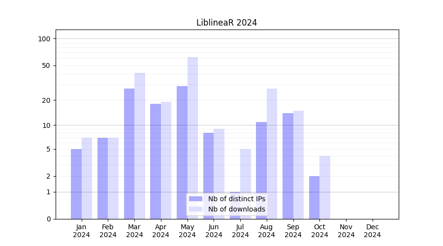 Number of downloads for software package LiblineaR, year by year, from 2025 back to 2014 (years with no downloads are omitted):