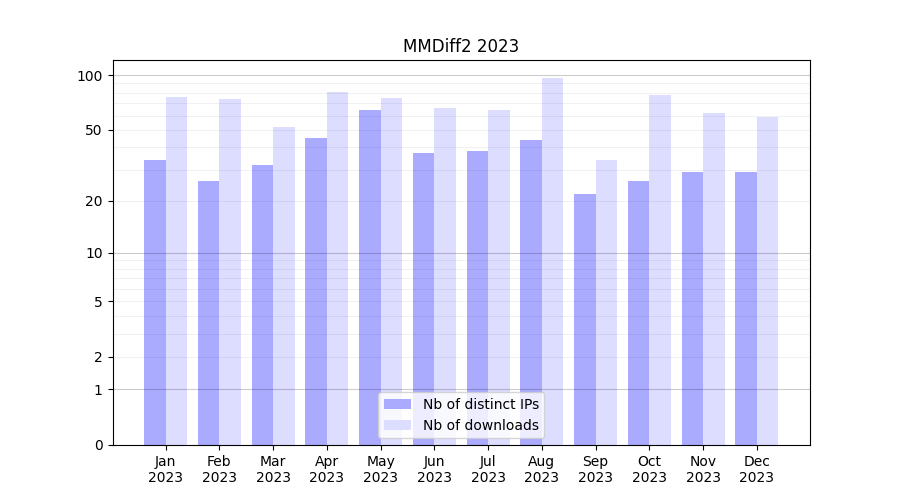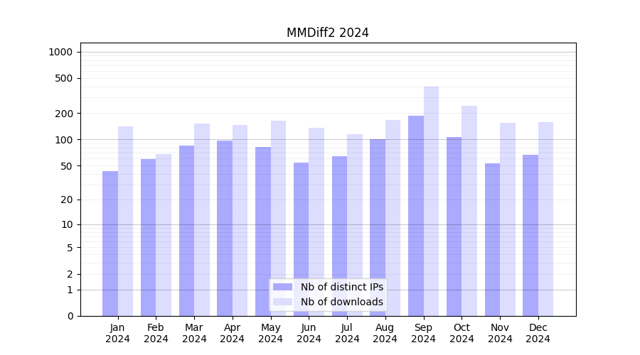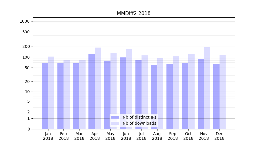 Number of downloads for software package MMDiff2, year by year, from 2025 back to 2014 (years with no downloads are omitted):