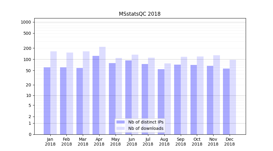 Number of downloads for software package MSstatsQC, year by year, from 2025 back to 2014 (years with no downloads are omitted):