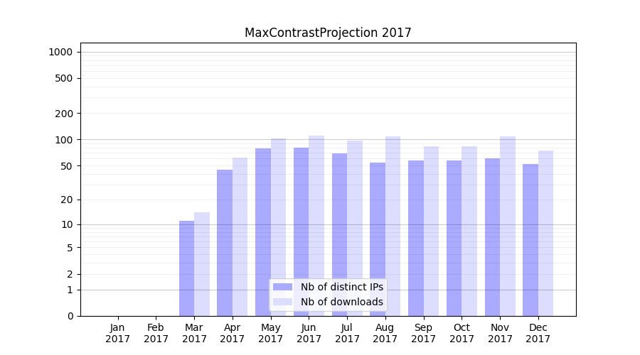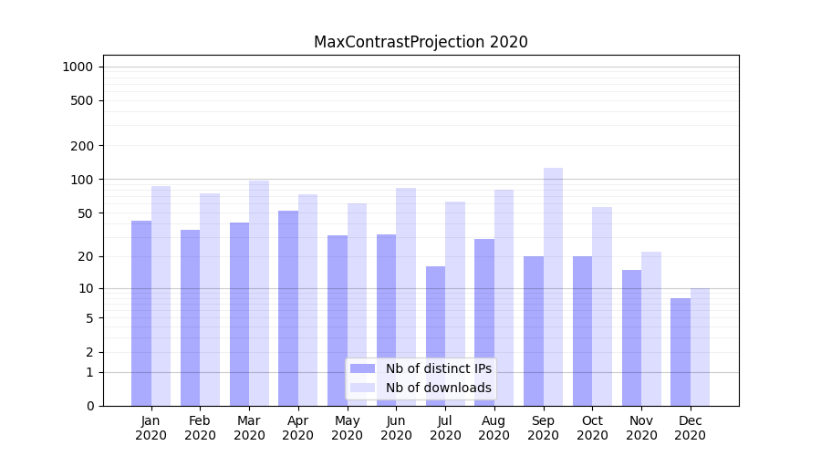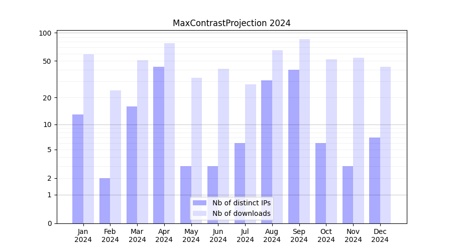 Number of downloads for software package MaxContrastProjection, year by year, from 2025 back to 2014 (years with no downloads are omitted):