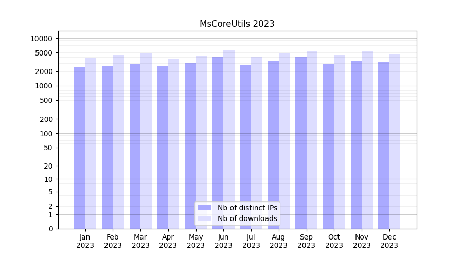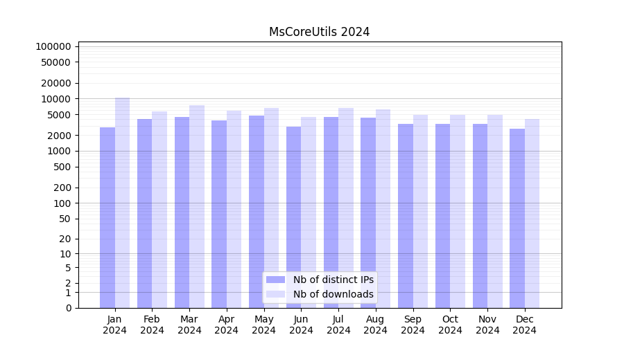 Number of downloads for software package MsCoreUtils, year by year, from 2025 back to 2014 (years with no downloads are omitted):