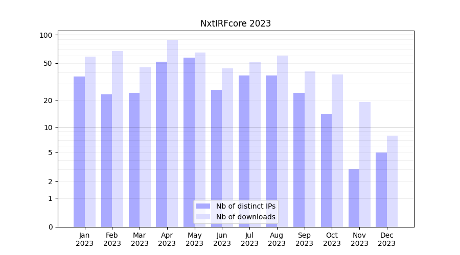 Number of downloads for software package NxtIRFcore, year by year, from 2025 back to 2014 (years with no downloads are omitted):