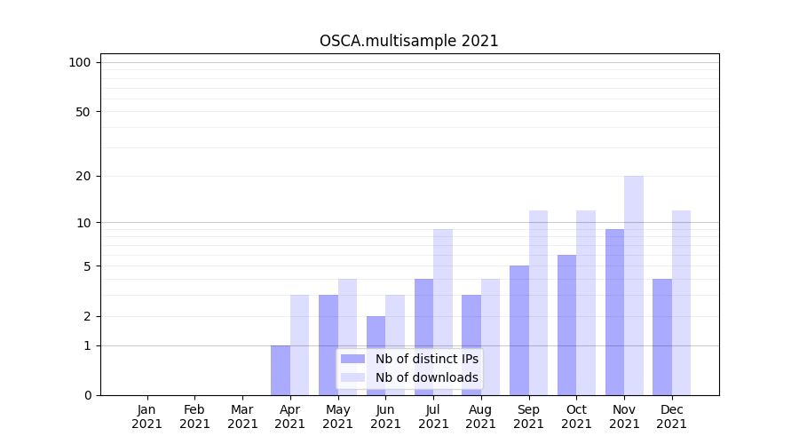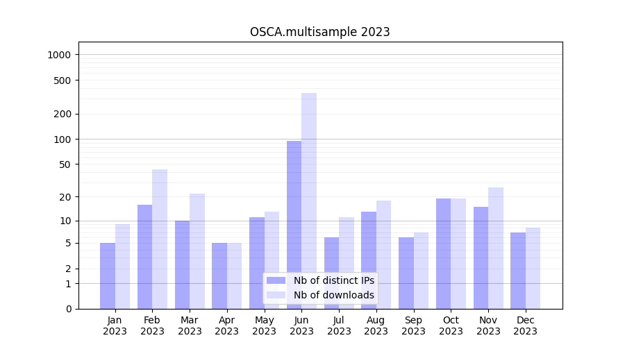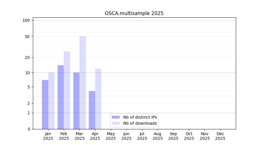 Number of downloads for software package OSCA.multisample, year by year, from 2025 back to 2014 (years with no downloads are omitted):