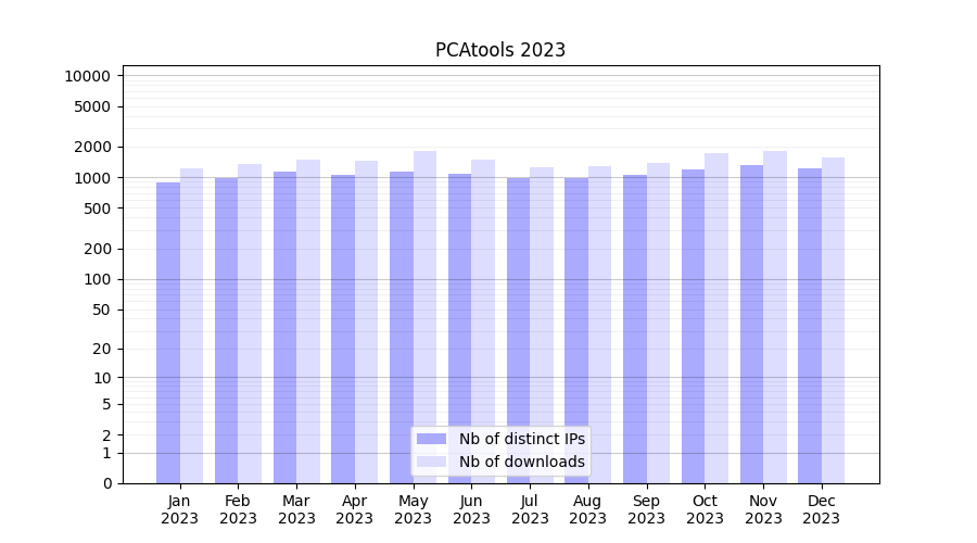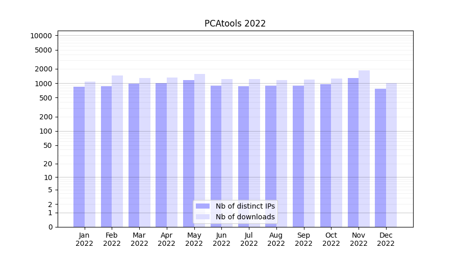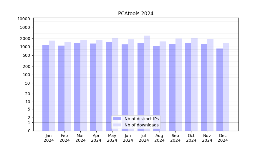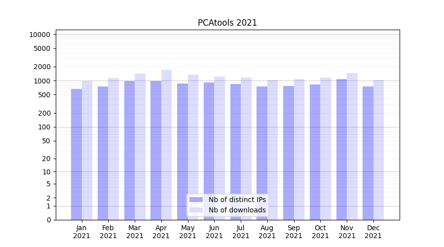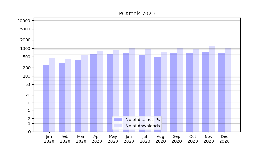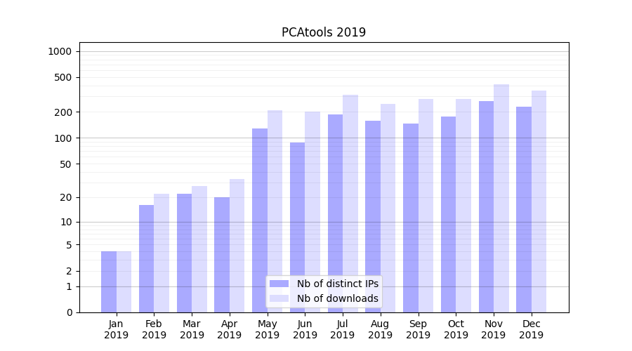 Number of downloads for software package PCAtools, year by year, from 2025 back to 2014 (years with no downloads are omitted):
