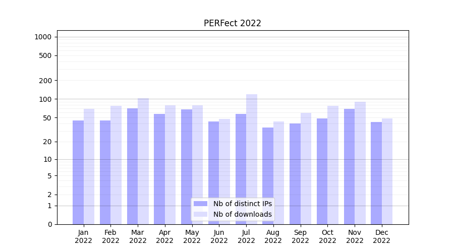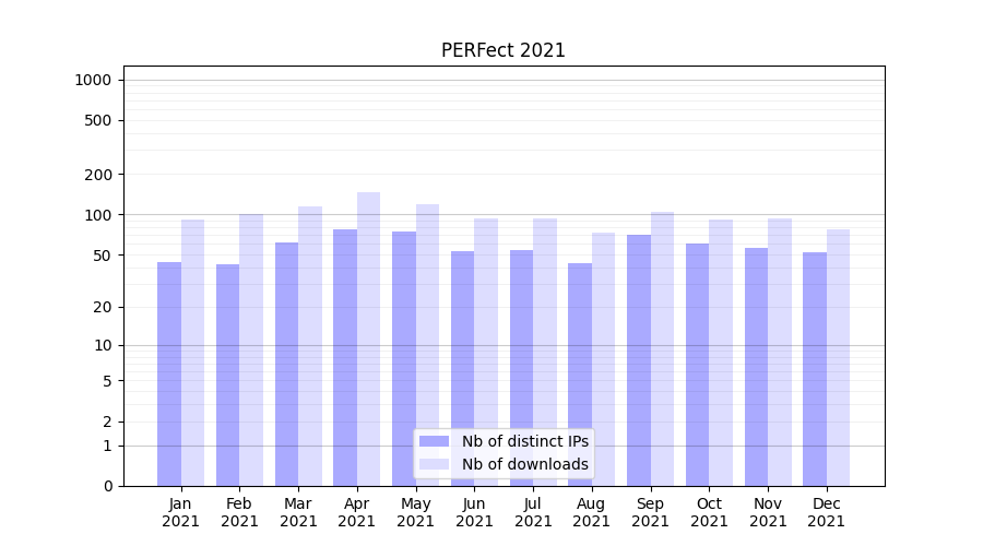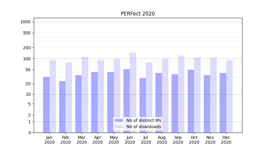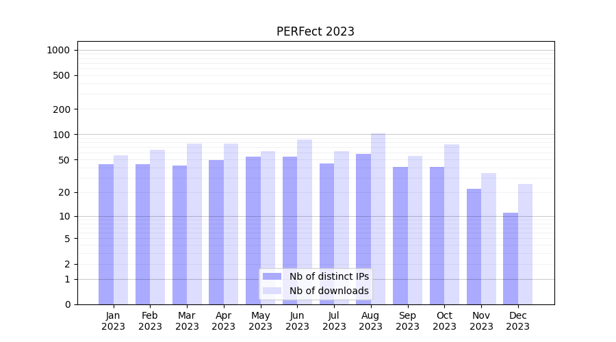 Number of downloads for software package PERFect, year by year, from 2025 back to 2014 (years with no downloads are omitted):
