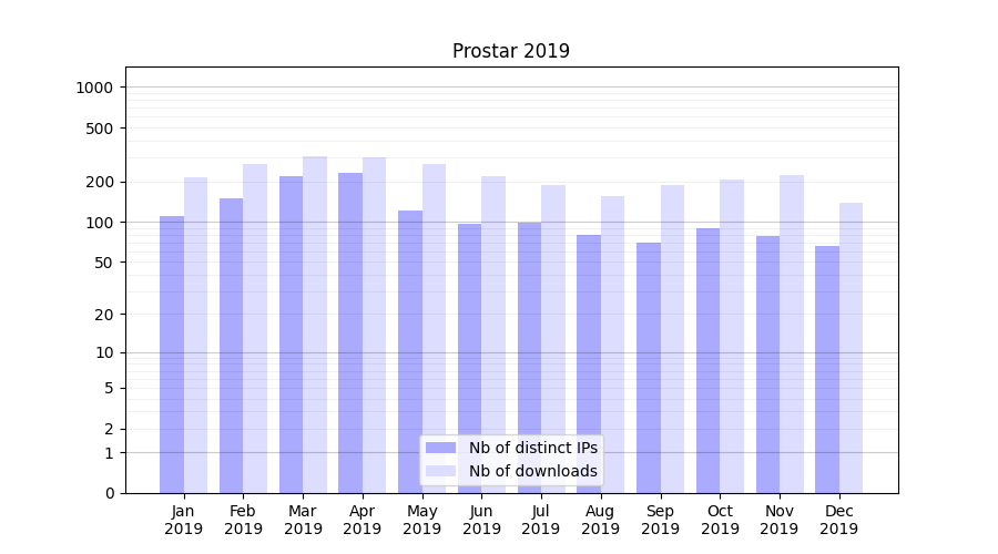 Number of downloads for software package Prostar, year by year, from 2025 back to 2014 (years with no downloads are omitted):