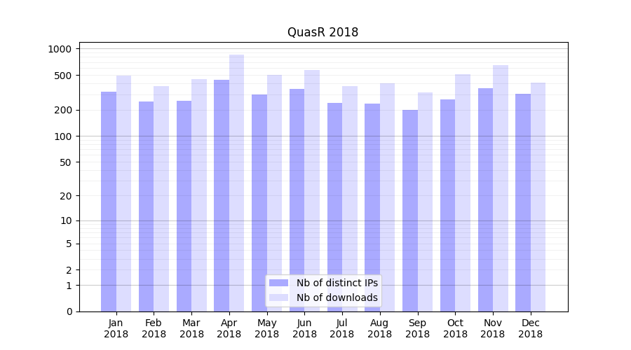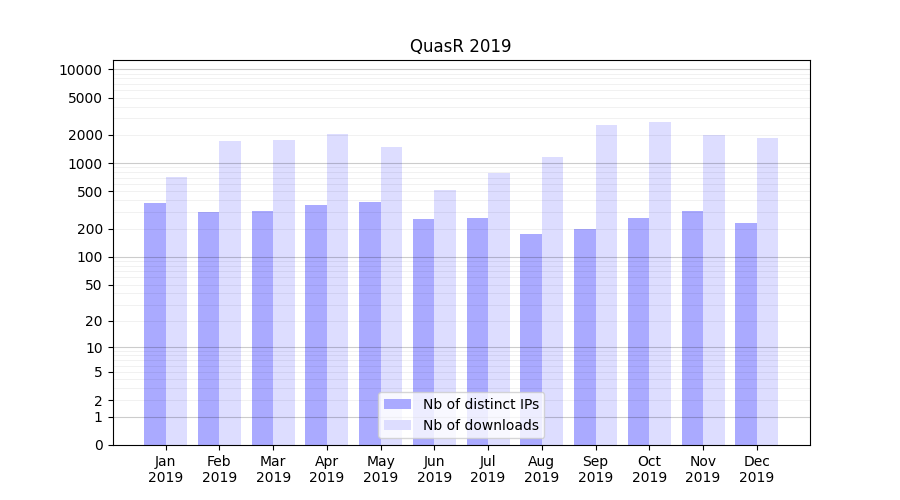 Number of downloads for software package QuasR, year by year, from 2025 back to 2014 (years with no downloads are omitted):