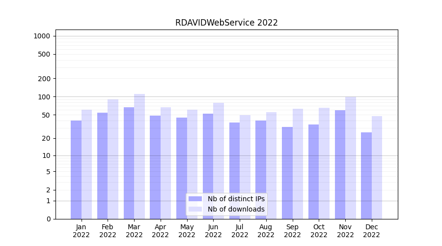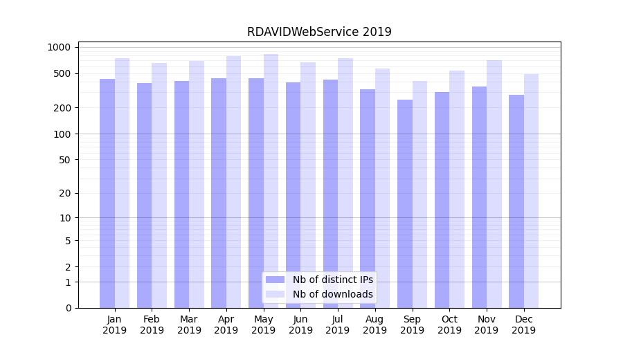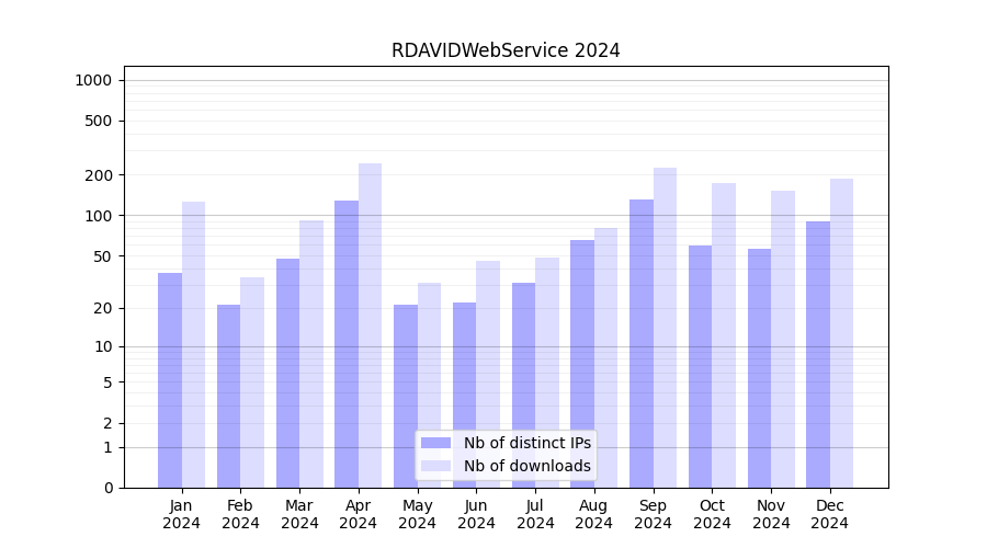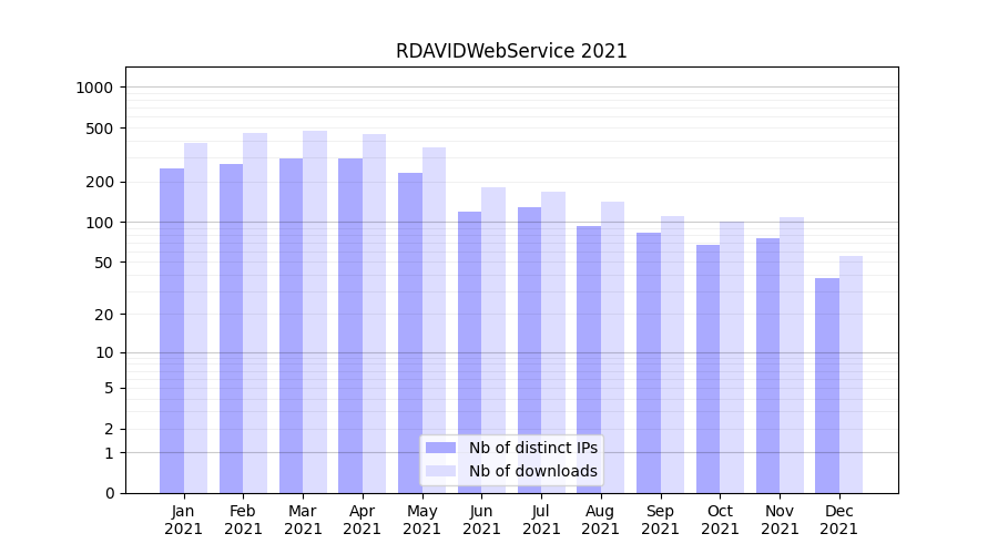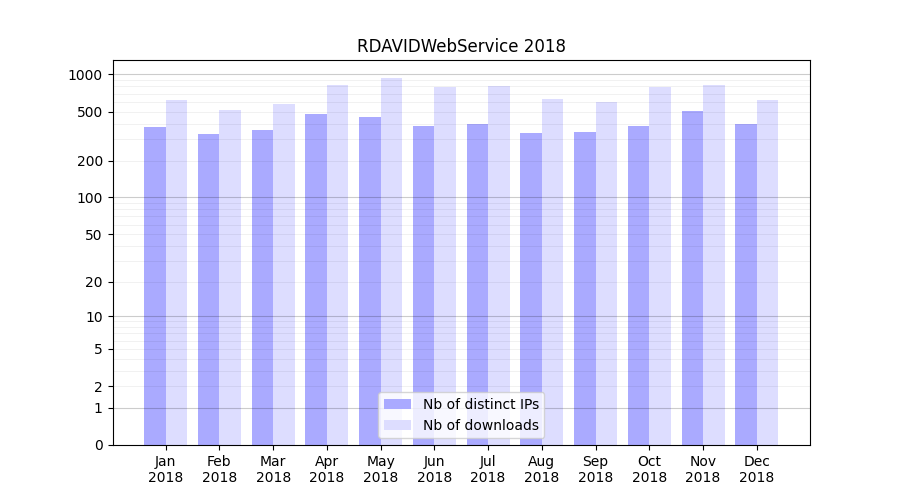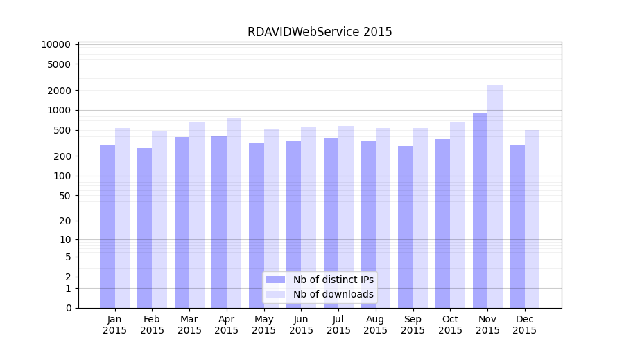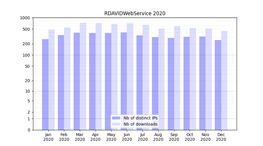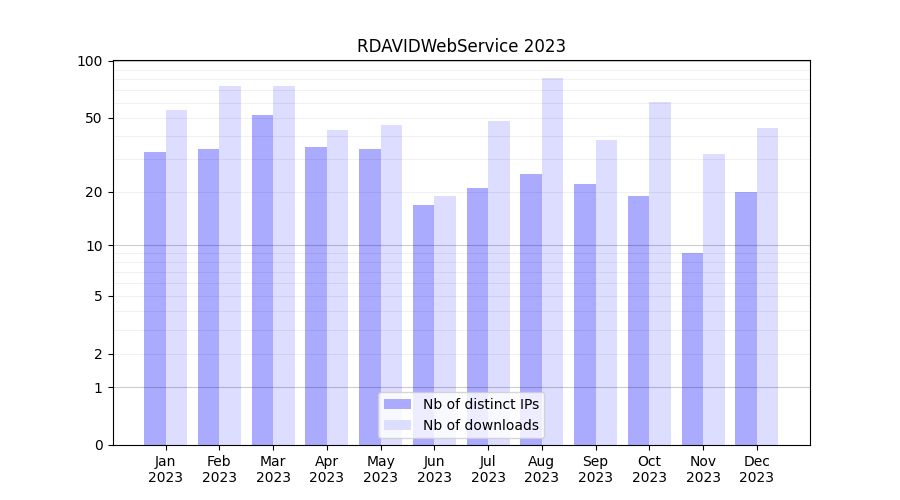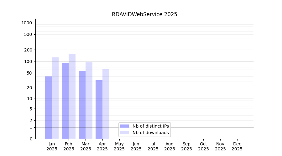 Number of downloads for software package RDAVIDWebService, year by year, from 2025 back to 2014 (years with no downloads are omitted):