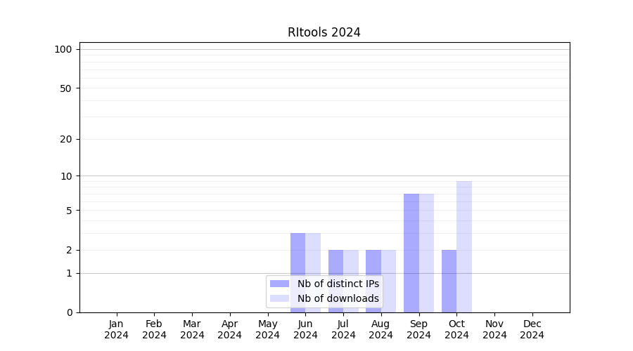 Number of downloads for software package RItools, year by year, from 2025 back to 2014 (years with no downloads are omitted):