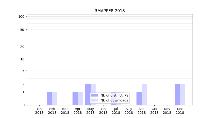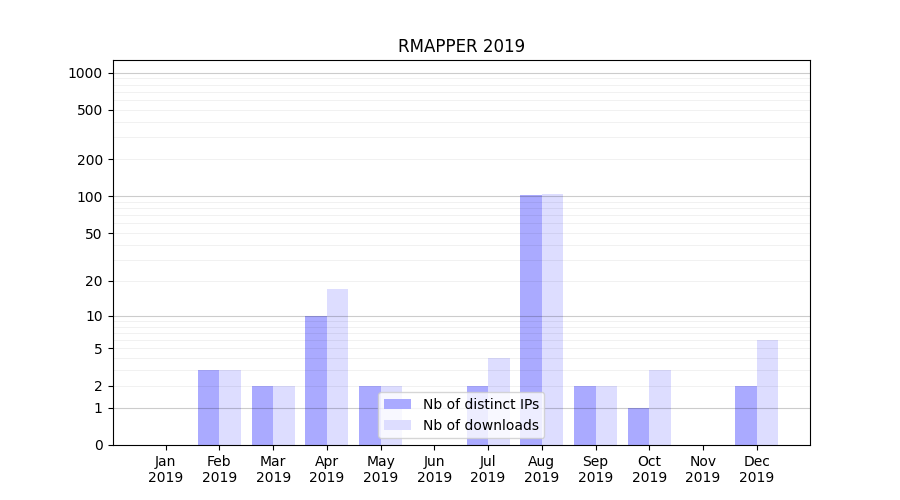Number of downloads for software package RMAPPER, year by year, from 2025 back to 2014 (years with no downloads are omitted):