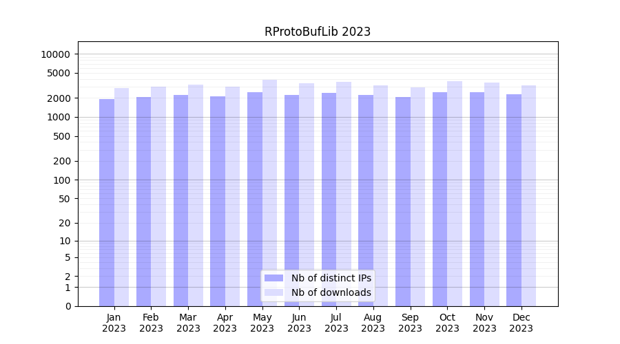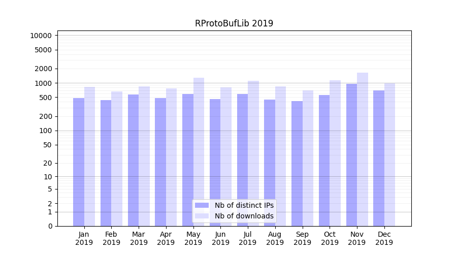 Number of downloads for software package RProtoBufLib, year by year, from 2025 back to 2014 (years with no downloads are omitted):