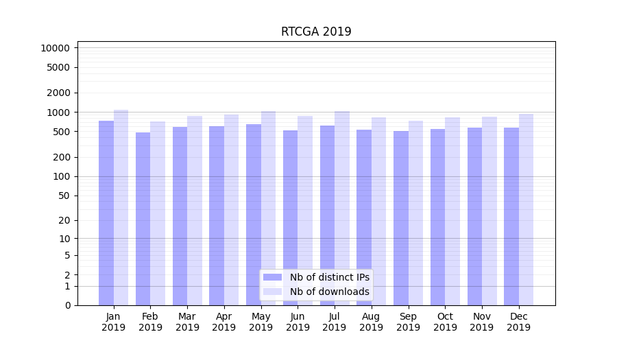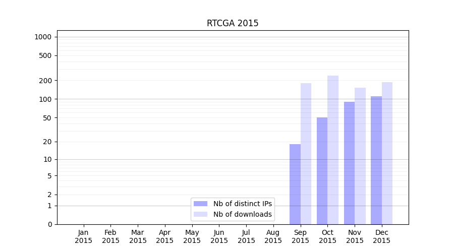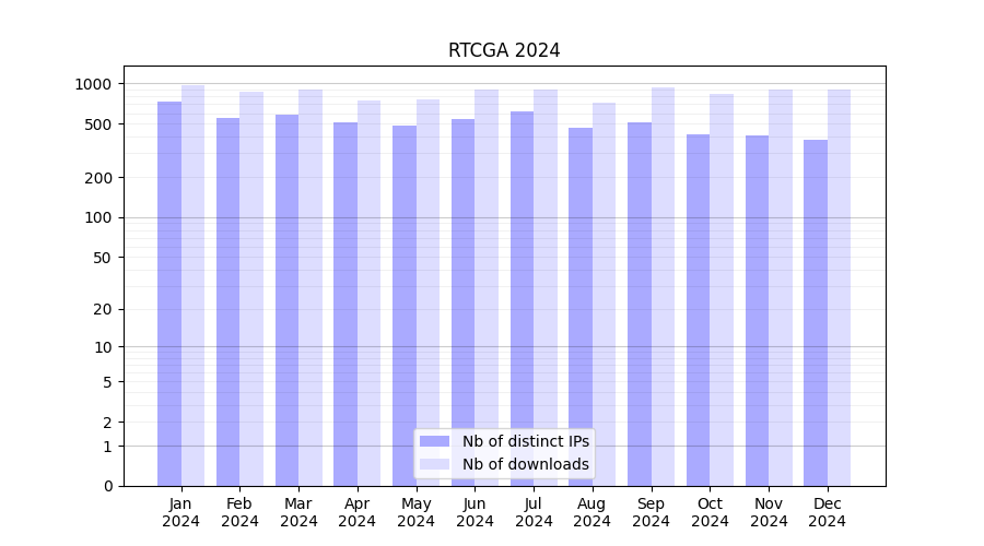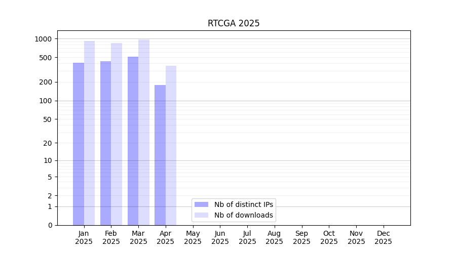 Number of downloads for software package RTCGA, year by year, from 2025 back to 2014 (years with no downloads are omitted):