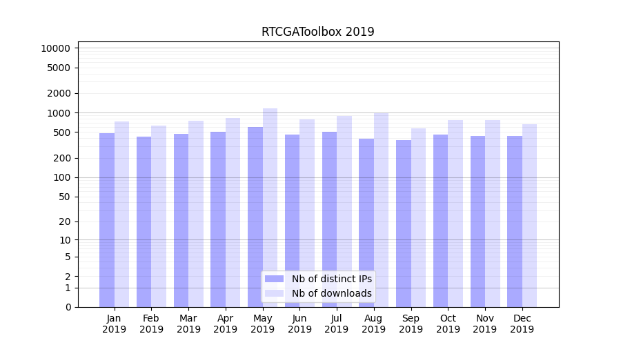 Number of downloads for software package RTCGAToolbox, year by year, from 2025 back to 2014 (years with no downloads are omitted):