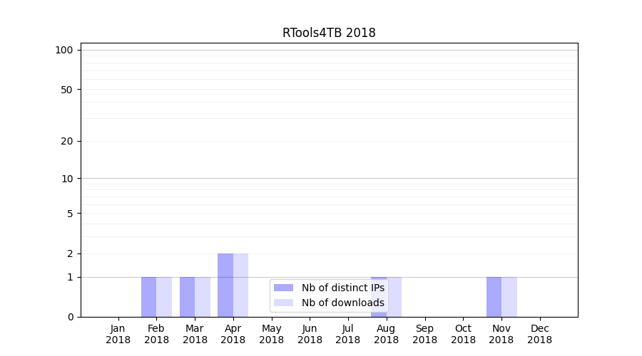 Number of downloads for software package RTools4TB, year by year, from 2025 back to 2014 (years with no downloads are omitted):