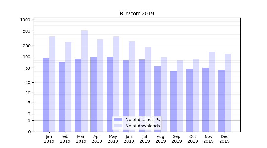 Number of downloads for software package RUVcorr, year by year, from 2025 back to 2014 (years with no downloads are omitted):