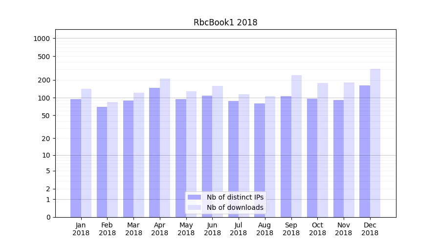 Number of downloads for software package RbcBook1, year by year, from 2025 back to 2014 (years with no downloads are omitted):