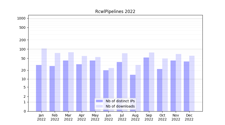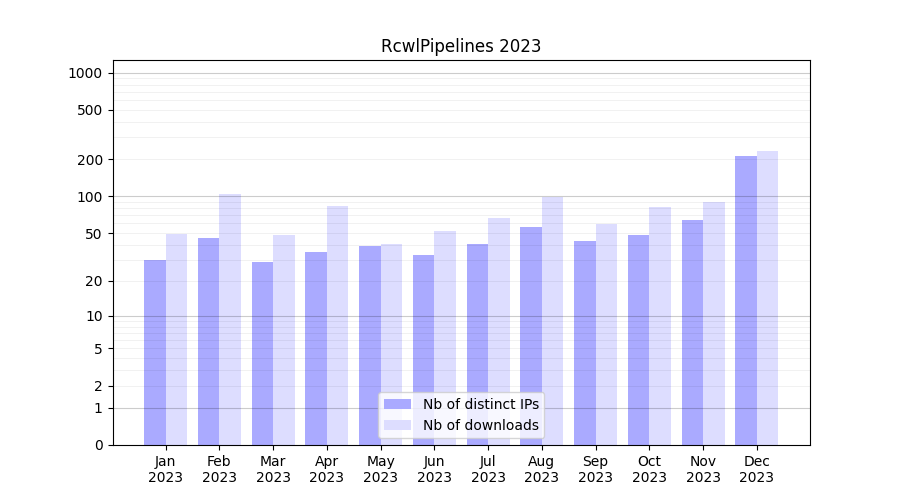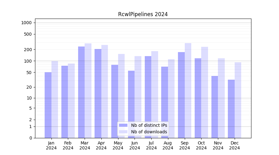 Number of downloads for software package RcwlPipelines, year by year, from 2025 back to 2014 (years with no downloads are omitted):