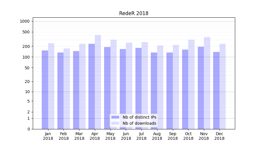 Number of downloads for software package RedeR, year by year, from 2025 back to 2014 (years with no downloads are omitted):