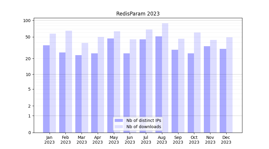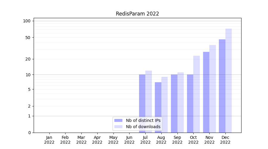 Number of downloads for software package RedisParam, year by year, from 2025 back to 2014 (years with no downloads are omitted):