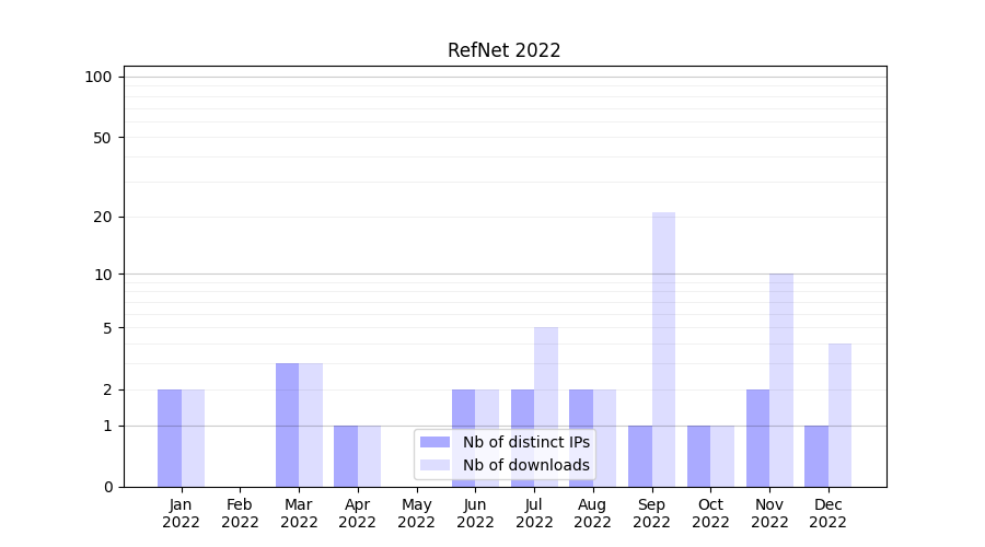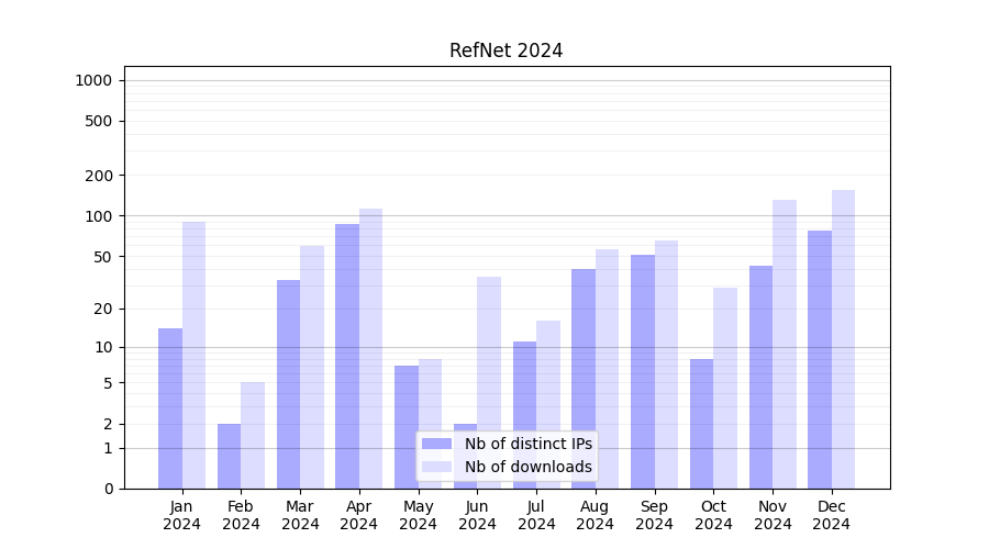 Number of downloads for software package RefNet, year by year, from 2025 back to 2014 (years with no downloads are omitted):