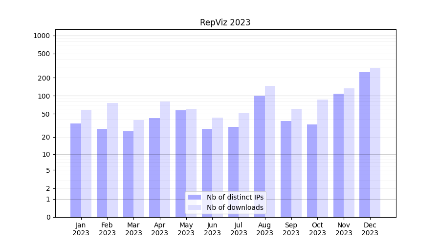 Number of downloads for software package RepViz, year by year, from 2025 back to 2014 (years with no downloads are omitted):