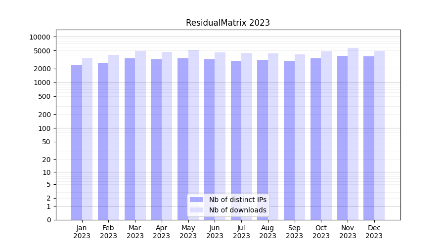 Number of downloads for software package ResidualMatrix, year by year, from 2025 back to 2014 (years with no downloads are omitted):