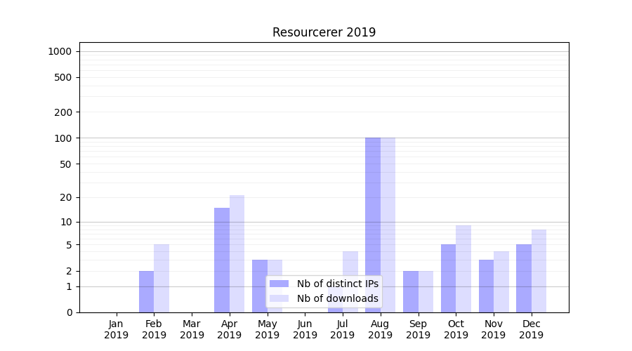 Number of downloads for software package Resourcerer, year by year, from 2025 back to 2014 (years with no downloads are omitted):