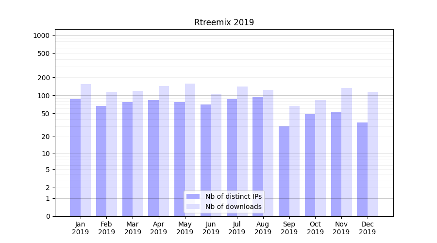 Number of downloads for software package Rtreemix, year by year, from 2025 back to 2014 (years with no downloads are omitted):