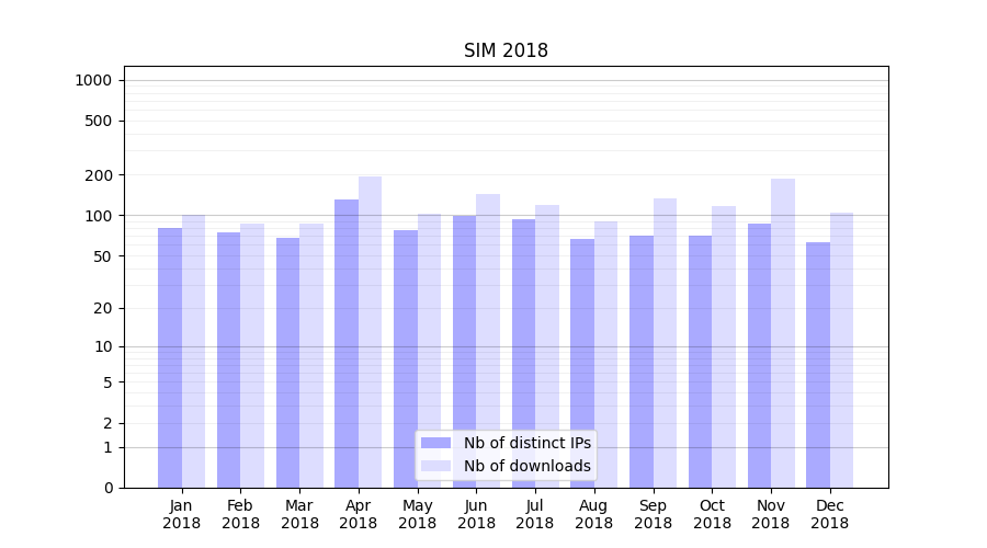 Number of downloads for software package SIM, year by year, from 2025 back to 2014 (years with no downloads are omitted):