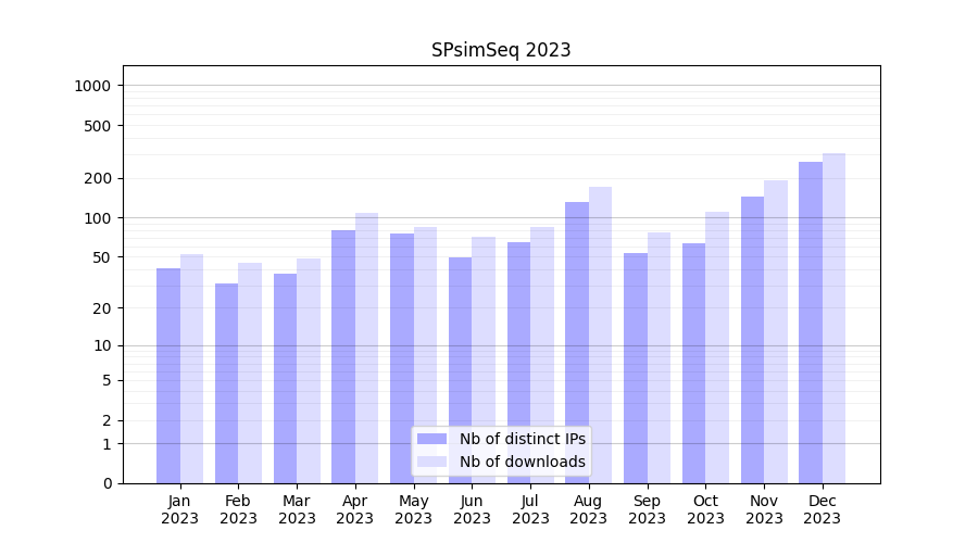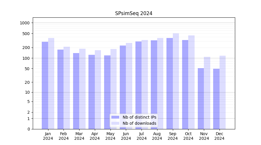 Number of downloads for software package SPsimSeq, year by year, from 2025 back to 2014 (years with no downloads are omitted):