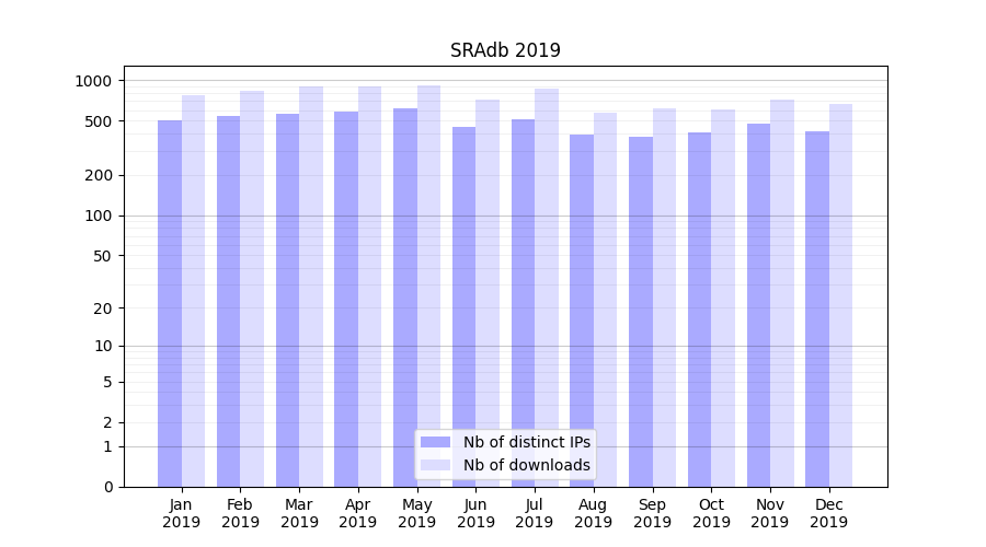 Number of downloads for software package SRAdb, year by year, from 2025 back to 2014 (years with no downloads are omitted):