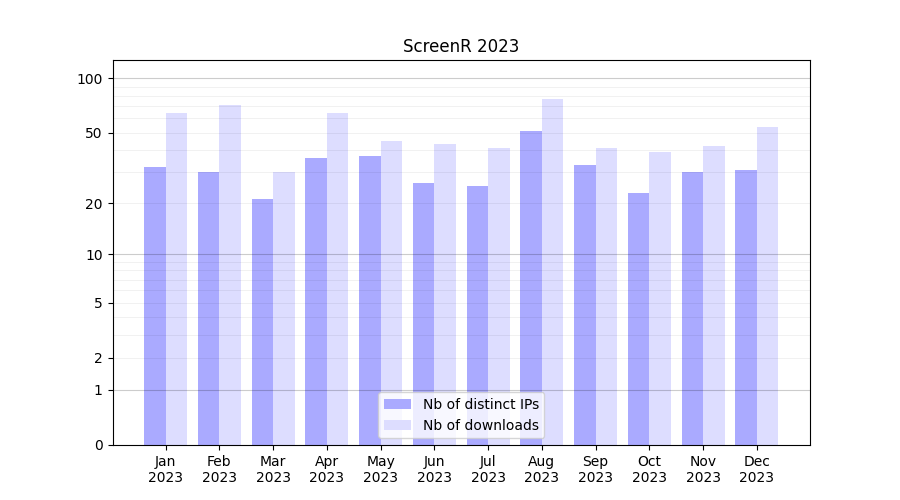 Number of downloads for software package ScreenR, year by year, from 2025 back to 2014 (years with no downloads are omitted):