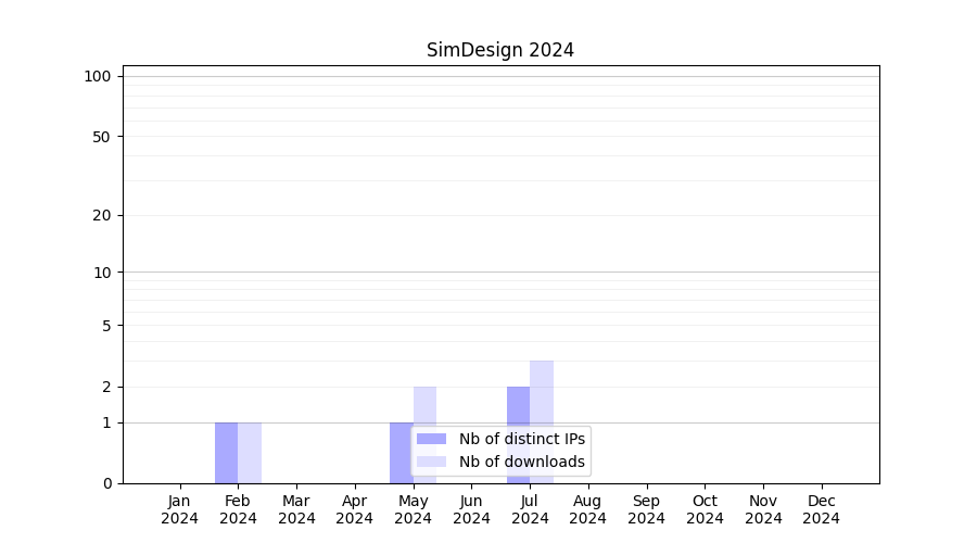 Number of downloads for software package SimDesign, year by year, from 2025 back to 2014 (years with no downloads are omitted):