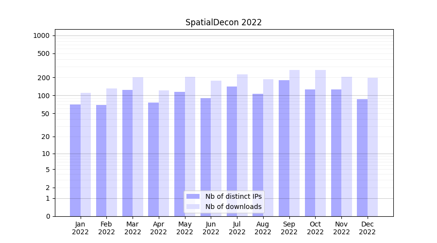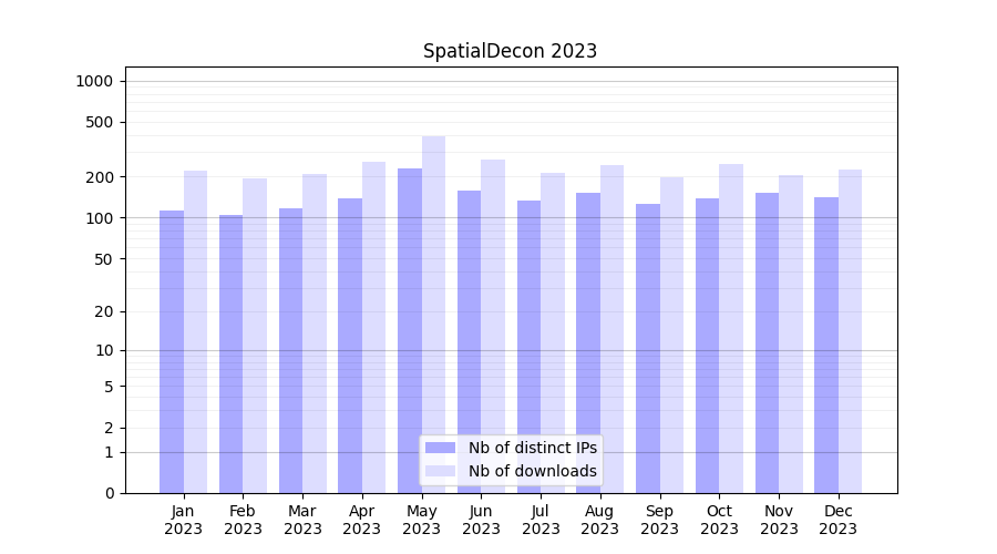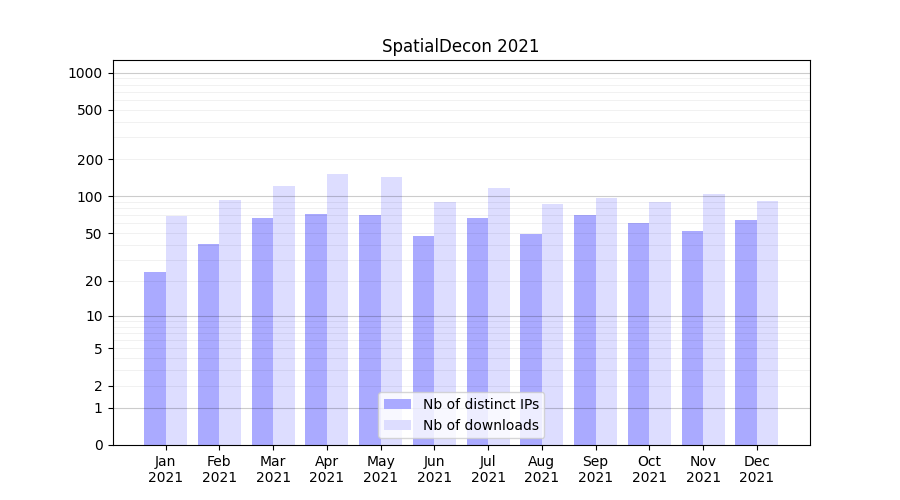 Number of downloads for software package SpatialDecon, year by year, from 2025 back to 2014 (years with no downloads are omitted):