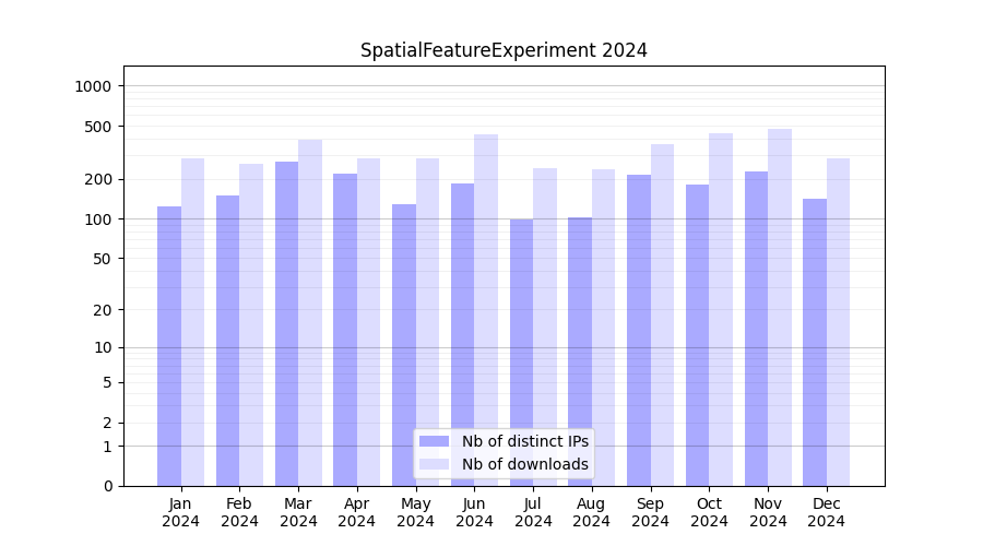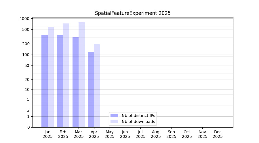 Number of downloads for software package SpatialFeatureExperiment, year by year, from 2025 back to 2014 (years with no downloads are omitted):