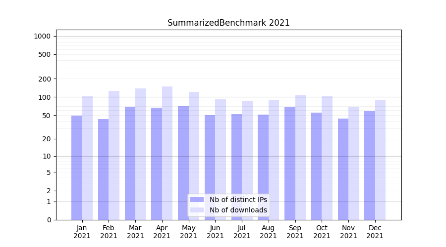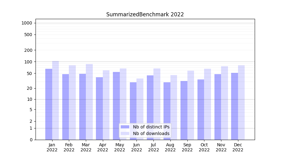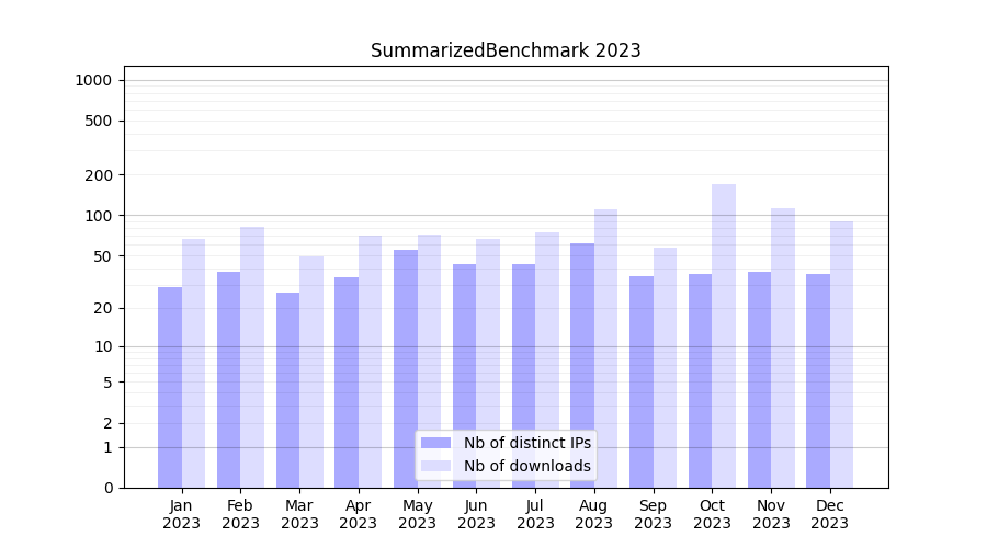 Number of downloads for software package SummarizedBenchmark, year by year, from 2025 back to 2014 (years with no downloads are omitted):