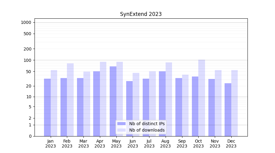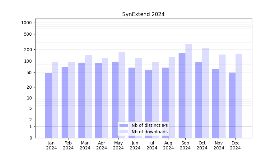 Number of downloads for software package SynExtend, year by year, from 2025 back to 2014 (years with no downloads are omitted):