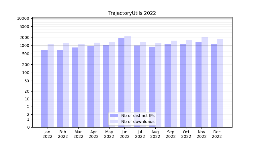 Number of downloads for software package TrajectoryUtils, year by year, from 2025 back to 2014 (years with no downloads are omitted):