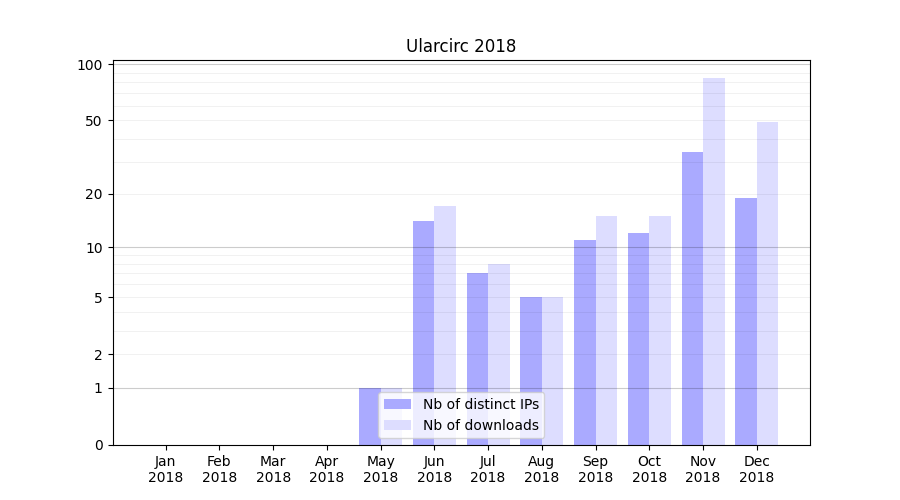 Number of downloads for software package Ularcirc, year by year, from 2025 back to 2014 (years with no downloads are omitted):