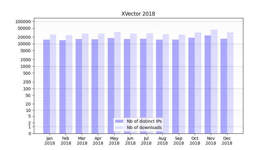 Number of downloads for software package XVector, year by year, from 2025 back to 2014 (years with no downloads are omitted):