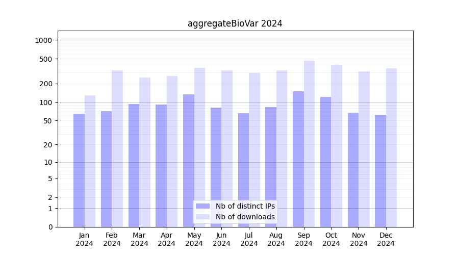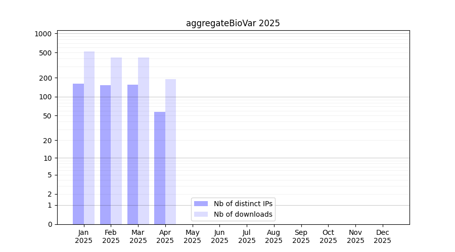 Number of downloads for software package aggregateBioVar, year by year, from 2025 back to 2014 (years with no downloads are omitted):