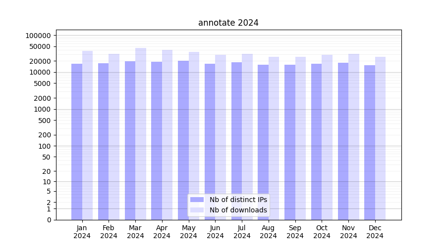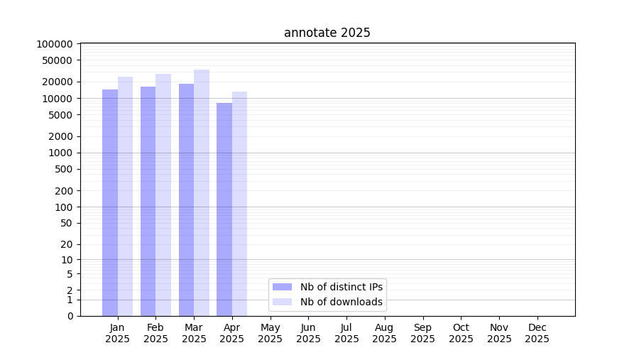 Number of downloads for software package annotate, year by year, from 2025 back to 2014 (years with no downloads are omitted):