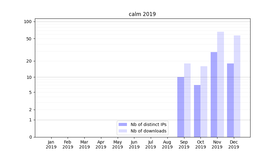 Number of downloads for software package calm, year by year, from 2025 back to 2014 (years with no downloads are omitted):