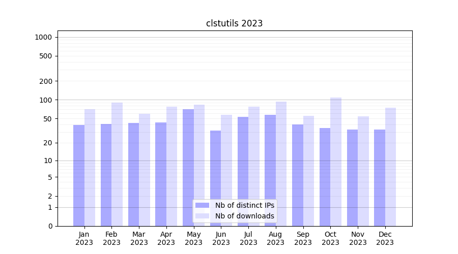 Number of downloads for software package clstutils, year by year, from 2025 back to 2014 (years with no downloads are omitted):