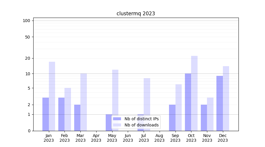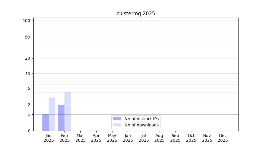 Number of downloads for software package clustermq, year by year, from 2025 back to 2014 (years with no downloads are omitted):