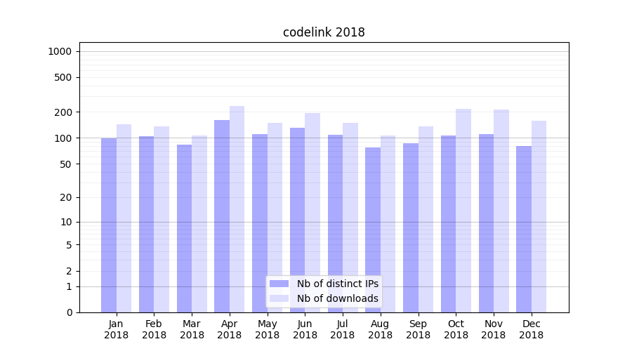 Number of downloads for software package codelink, year by year, from 2025 back to 2014 (years with no downloads are omitted):