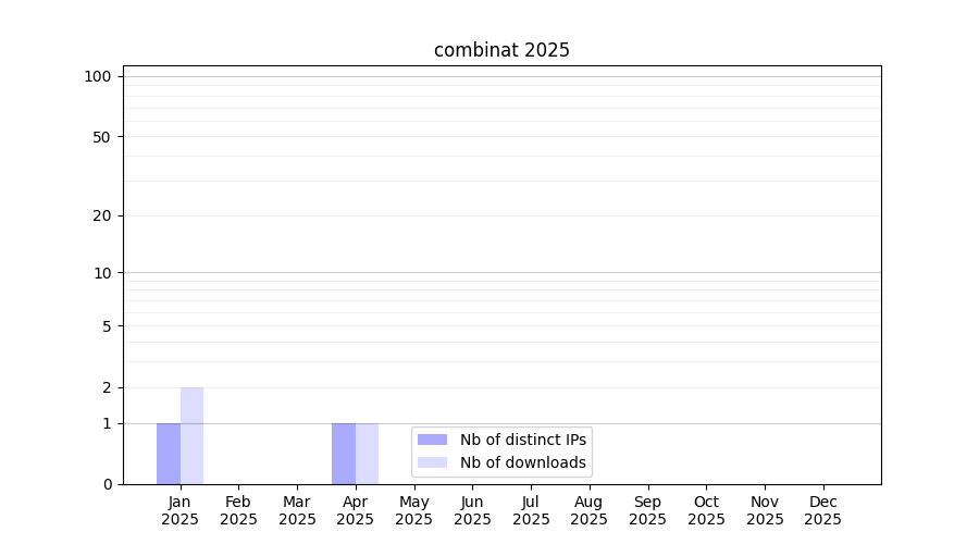 Number of downloads for software package combinat, year by year, from 2025 back to 2014 (years with no downloads are omitted):