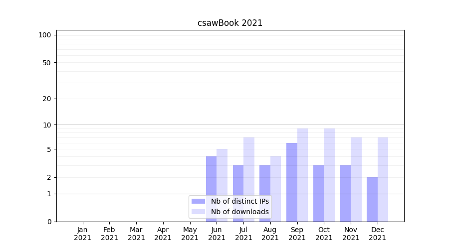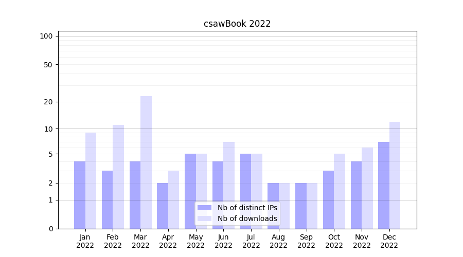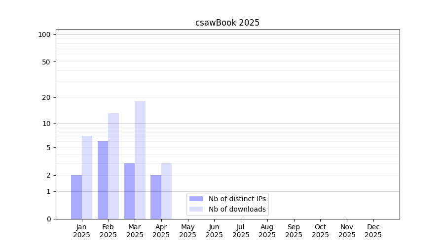 Number of downloads for software package csawBook, year by year, from 2025 back to 2014 (years with no downloads are omitted):