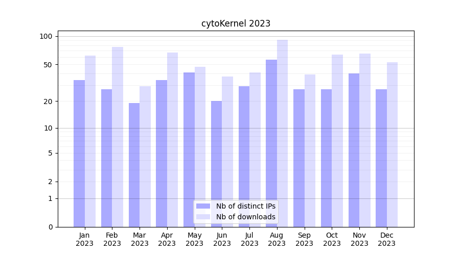 Number of downloads for software package cytoKernel, year by year, from 2025 back to 2014 (years with no downloads are omitted):