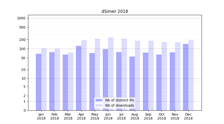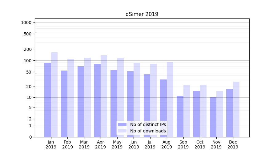 Number of downloads for software package dSimer, year by year, from 2025 back to 2014 (years with no downloads are omitted):
